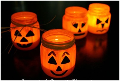 Ngoài ra bạn còn có thể chọn cách dán giấy màu cam lên các lọ nhựa, lọ thủy tinh có sẵn trong nhà, vẽ hoặc dán lên đó những khuôn mặt có vẻ rùng rợn một chút, rồi thắp sáng chúng bằng những viên nến tealight nhỏ nhắn. Cách này vẫn rất đẹp mà lại chẳng hề tốn kém là bao. Bạn có thể mua cả một hộp nến tealight tại Hà Nội với giá cực “mềm”.